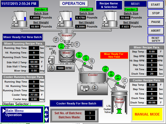 Safety interlock and alarm monitoring system will let the operator know where in the line a fault has occurred which can be address quickly minimising downtime. For example, if someone has left an interlocked door open, the Central Control System identify which interlock is open and will prevent that machine from running in an unsafe state. The line control can be programmed to prevent other machinery from running. For example, if someone has opened a safety cage for a blender the Central Control System will prevent product from being loaded into the blender without the blender running.