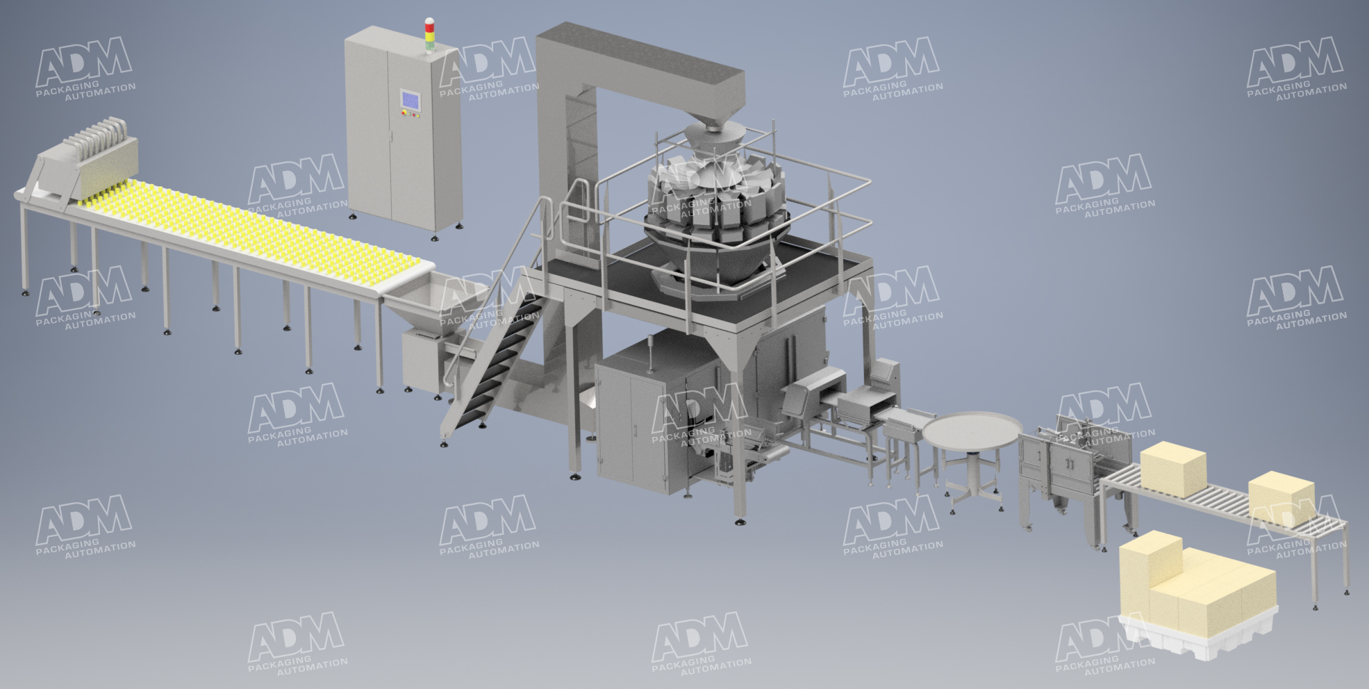 ADM can supply a full turnkey solution for a fully automated confectionery packaging line. This includes bulk product transport such as bulk bag frame, vibratory feeders, conveyors and bucket elevations. ADM also supply a range of custom weighing machines such as the linear weighers and multihead weighers fitted with custom features like teflon coating, custom feeding pans and high angle chutes. Our end of line equipment includes metal detectors and check weighers to ensure that your product weight is within specification and free of metal contamination.